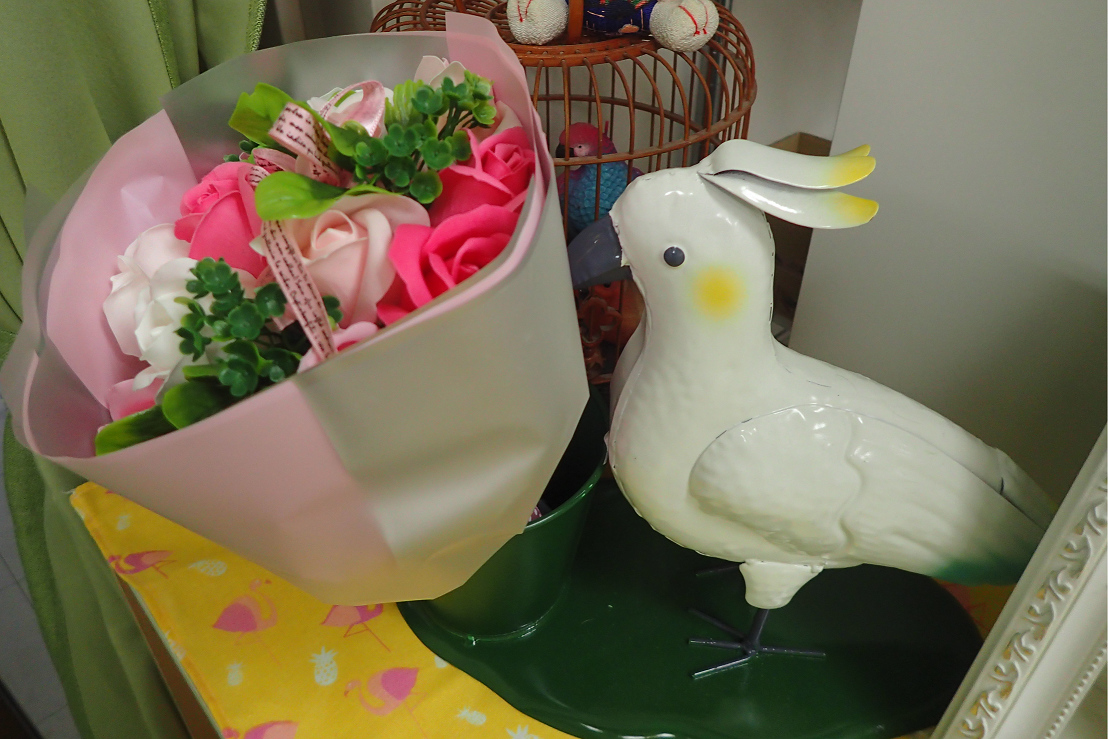 昨日無事に開業5年目を迎えました。 写真は開業お祝いに頂いた白色バタンの置物と石鹸で作られた花です。 本物そっくり!